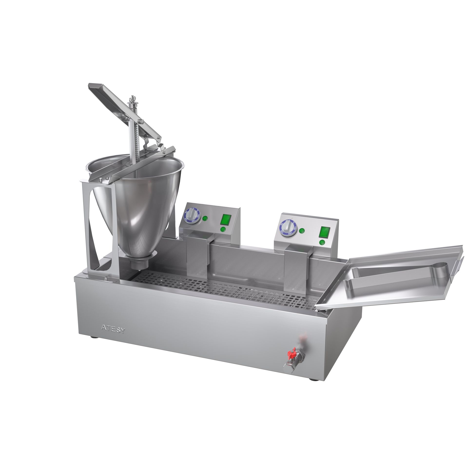 970x515x610мм, 7,8 кВт, 220 В, +50…+190 °С, производительность 500 кваркини/час, объем заливаемого масла (фритюра) 10 л, объем дозатора 6 л, время приготовления кваркини 180 с, масса кваркини26±2 г, одновременное приготовление кваркини в ванне 45 шт.