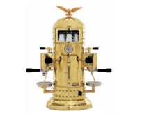 490x490x1070 мм, 220 V, 2,6 кВт, 76 кг, Кофемашина традиционная трехрожковая, автомат осуществляет автодозацию, автоуровень воды, подачу пара, подачу кипятка, программирование количества воды на порцию. Объем бойлера - 14,8л. Цвет корпуса - латунный. Кофемашина имеет вертикальную форму. На верхушке находится фигурка орла с раскинутыми крыльями. Под"куполом" располагается подогреватель для чашек. Машина имеет манометр с двойной шкалой, клапан горячей воды, клапан пара, фильтродержатель. Дизайн основывается на текстуре, полученной в результате ударов молотка (вручную), что создает легкий эффект перламутра.