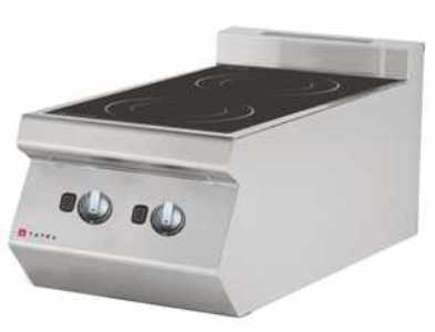 400х760х475 мм, 400В, 7 кВт, 2 конфорки 3,5 кВт, 30 уровней мощности, режимы"подогрев" и"медленное кипение", установка данной модели на плоские поверхности допускается только при использовании инсталлированных ножек, входящих в комплект, при установке на специальную подставку ножки используются как крепежные винты.