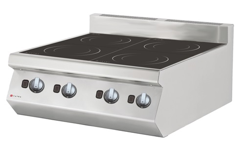 800х760х475 мм, 400В, 14 кВт, 4 конфорки 3,5 кВт, 30 уровней мощности, режимы"подогрев" и"медленное кипение", установка данной модели на плоские поверхности допускается только при использовании инсталлированных ножек, входящих в комплект, при установке на специальную подставку ножки используются как крепежные винты.