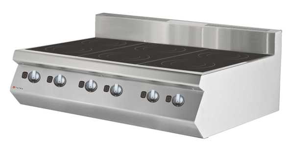 1200х760х475 мм, 400В, 21 кВт, 6 конфорок 3,5 кВт, 30 уровней мощности, режимы"подогрев" и"медленное кипение", установка данной модели на плоские поверхности допускается только при использовании инсталлированных ножек, входящих в комплект, при установке на специальную подставку ножки используются как крепежные винты.