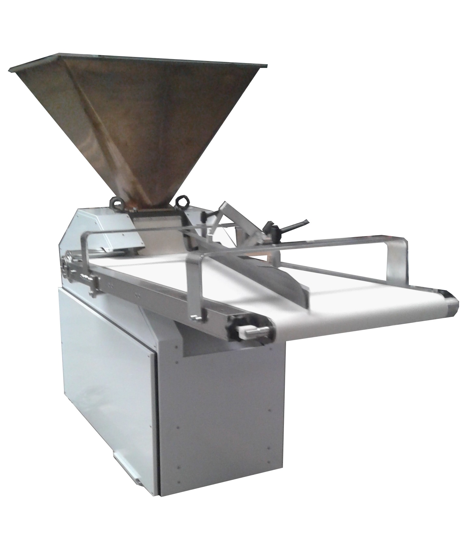 1803х703х1106мм, 2,2кВт, 960-2400 шт/ч, цилиндр из нержавеющей стали inox, электронная регулировка скорости, ручное регулирование веса заготовок с округлением, регулировка высоты ленты, окрашен белым лаком горячей сушки, объем поршня 110 (70-850г)