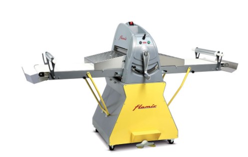 2410*910*1335мм, 0,5кВт, 380В, 1070*910*1760мм в сложенном положении, размер ленты транспортера 500*1000мм, скорость движения конвейера 28 м/мин, максимальная загрузка теста на ленту 5-6 кг, теоретическая производительность 20-24 кг/час, зазор между раскатывающими валками 0,2-35 мм, электро-механическое управление джойстиком и педалью (в стандартной комплектации), дисплей отображения толщины раскатки, корпус покрыт эпоксидной краской