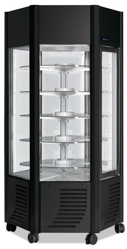 1010*900*1900мм, 0,50 кВт, 230В, вертикальная охлаждаемая витрина шестиугольная, температурный режим +2°/+10°С, хладагент R452a, вентилируемое охлаждение, панорамное остекление, 5 круглых вращающихся полок из стекла, сенсорная панель управления, LED-подсветка, авторазмораживание, на колесах, открываются передняя и задняя двери, используется для демонстрации холодных мясных блюд и сыров, сырого мяса, тестовых заготовок, кондитерских изделий, цвет панелей черный (опционально возможно выбрать любой цвет RAL)